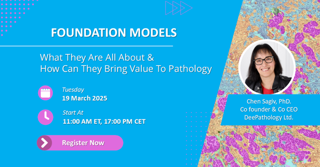 Recently developed pathology foundation models are making a lot of waves in the AI for Pathology pond. In this webinar Dr. Chen Sagiv, co founder and co CEO of DeePathology will provide an intuitive introduction to Foundation Models in general and in pathology in particular and will show how DeePathology has developed an unsupervised segmentation […]
